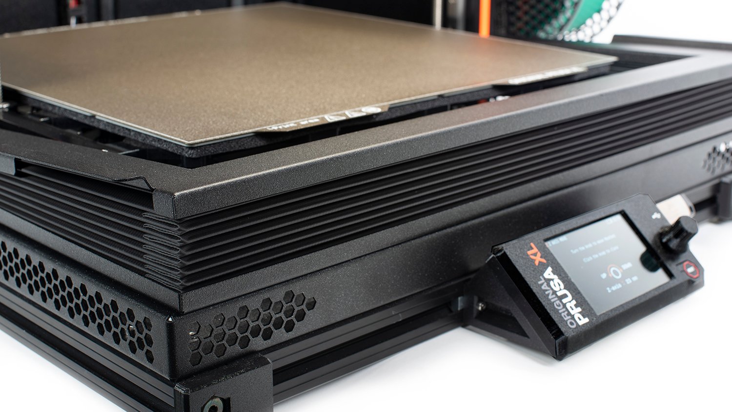 Original Prusa XL Enclosure makes printing from certain materials easier, and at the same time, it adds a lot of other benefits. Advanced Filtration System with HEPA filter (99.9% efficiency) helps to reduce odors and prevents the spread of ultra-fine particles (UFPS) into the air. The XL printer automatically controls the filtration and utilizes airflow where the air is drawn in from below and blown through the HEPA filter out of the Enclosure. You can check the temperature inside the Enclosure using the thermometer, located on the Enclosure door (indication only), or using the information on the printer display.