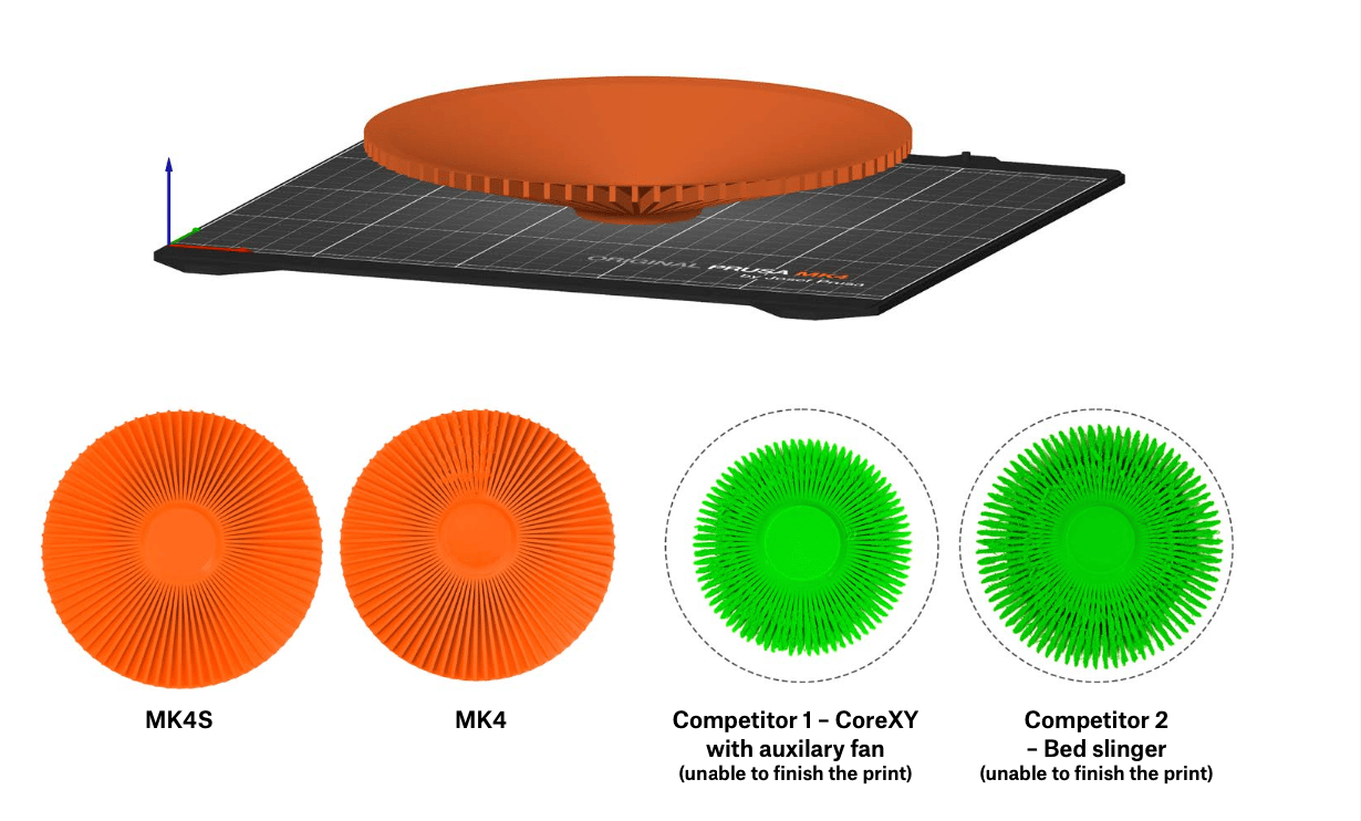 Wie Tom's Hardware schreibt : Der MK4S von Prusa ist verflixt schnell. Er verkürzt die Druckzeiten erheblich dank des neuen Lüfters mit einer leistungsstarken Turbine und einer 360°-Luftzufuhr sowie der High-Flow-Düse, die einen maximalen Filament-Fluss ermöglicht. In Kombination mit optimierter Firmware und Druckprofilen, sind die Ergebnisse sowohl schnell als auch makellos.