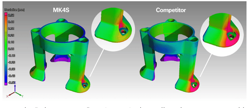 Ihre Kreationen sollten genau so ausfallen, wie sie entworfen wurden, insbesondere wenn sie eine perfekte Passform erfordern. Der MK4S sorgt dafür, indem er außergewöhnlich genaue Drucke liefert. Sehen Sie sich den Genauigkeitsvergleich an, der mit einem CT-Scan gemessen wurde: