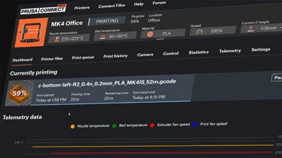 Prusa Connect is a cloud remote printing solution developed in-house by Prusa Research. It allows you to manage G-codes and control your 3D printer remotely, no matter where you are.